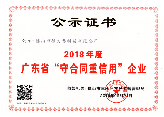 在當(dāng)前深化社會經(jīng)濟體制改革,應(yīng)對國際金融危機、促進社會經(jīng)濟可持續(xù)發(fā)展的新形勢下,德力泰依然初心不改,砥礪前行,不但順應(yīng)時代發(fā)展潮流,不斷加大科研創(chuàng)新驅(qū)動,不斷刷新行業(yè)的創(chuàng)新技術(shù)和研發(fā)成果,以單機和陶機整線工程博擊全球市場,是一個眾多陶企青睞和政府部門肯定的、科技領(lǐng)先具有全球競爭力的陶機旗艦企業(yè),并受競爭者尊敬的企業(yè),更是一個非常注重合同和信用管理體系建設(shè)的企業(yè)。嚴(yán)格遵循“守合同、重信用”的相關(guān)規(guī)定,且對營造誠信經(jīng)營的良好市場環(huán)境樹立了榜樣形象,并于近日,收到了佛山市三水區(qū)市場監(jiān)督管理局頒發(fā)的“2018年度廣東省‘守合同重信用’企業(yè)”證書和授予的牌匾。