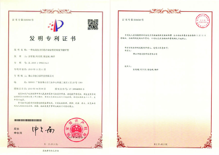 近日,德力泰收到了國家知識產權局授權的發明專利證書“一種高效接力回收冷卻余熱的陶瓷節能爐窯(專利號:ZL2016010992314.3)”。該專利技術可用于各類陶瓷窯爐,通過將尾冷的低溫熱風經緩冷區、急冷區接力加熱后可達350℃,回收后直接用于燒嘴助燃,多余的熱量用于坯體干燥,不僅綜合節能幅度大,而且實現了窯爐冷卻“零排放”,減少了熱污染,是公司獨創的結構,具有顯著的低碳節能、綠色環保效益。這個專利技術在實際應用上,我們叫DHR余熱再回收系統。