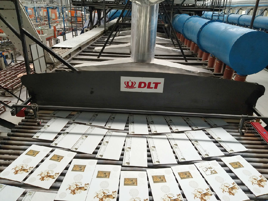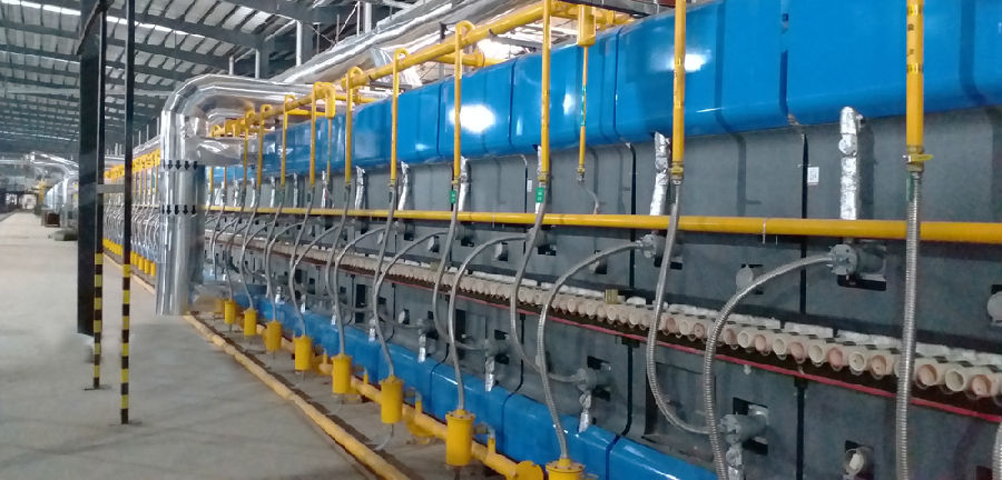 干燥及燒制部份則是由專門打造“高端、綠色、環(huán)保、智能”窯爐的德力泰提供。為滿足當(dāng)今市場需求下不同客戶的要求和產(chǎn)品結(jié)構(gòu),德力泰配備了一組新一代DFG系列素?zé)G和釉燒窯、一條DHD-EM1單層自循環(huán)干燥器及4條釉線和輔機設(shè)備。運用了多項專利技術(shù)及DHR、KHI、KPS等核心技術(shù),加上單層自循環(huán)干燥具有高效、均勻、快速、節(jié)能的特點,能最大限度達(dá)到節(jié)能及運轉(zhuǎn)平穩(wěn)性。目前出磚整齊、走磚穩(wěn)定、磚型優(yōu)秀,優(yōu)等率保持在95%以上,深受客戶好評。主要生產(chǎn)300*450、300*600、300*750、300*900mm等二次燒瓷片,日產(chǎn)量超過25000m2二次燒瓷片。