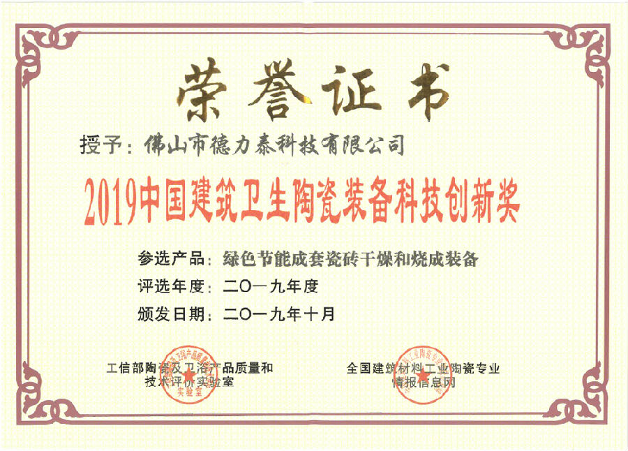在全球陶瓷行業(yè)競爭激烈、國內(nèi)環(huán)保高壓的形勢下,德力泰全體員工表現(xiàn)出頑強(qiáng)的斗志,銳意進(jìn)取、活力創(chuàng)新,秉承對行業(yè)負(fù)責(zé)的態(tài)度同時(shí),用積累的創(chuàng)新技術(shù)不斷爆發(fā)出新的力量,綠色節(jié)能成套瓷磚干燥和燒成裝備正是企業(yè)強(qiáng)大創(chuàng)新生命力的具體表現(xiàn)?!?019中國建筑衛(wèi)生陶瓷裝備科技創(chuàng)新獎”已充分證明德力泰是具有強(qiáng)大綜合實(shí)力和具有新興力量的創(chuàng)新品牌。